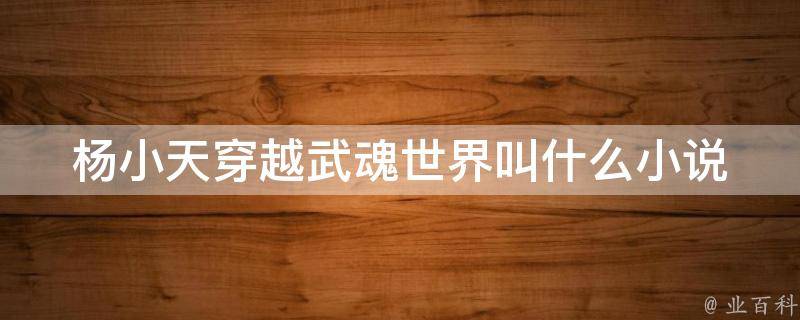 最佳答案杨小天穿越武魂世界叫《神剑无敌》。小说作者是神见,讲述了杨小天穿越武魂世界,觉醒超级武魂,却被误认为是二级武魂。但是,杨小天却以逆天的成长速度,不断刷新世人的认知。小说可以在笔下文学、起点中文网、笔趣说等平台进行阅读。