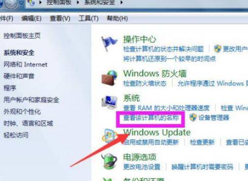 进入系统和安全页面,点击系统下面的“查看该计算机的名称”。