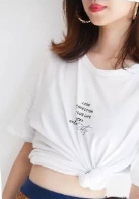 6、胸前打结:在胸前喜欢的位置将T恤向里卷,然后用皮筋将其固定。整理好外侧的褶皱。