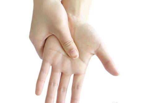 6、用大拇指由下往上按压另一只手的手掌心,直至掌心微微发热,两手交替动作用。