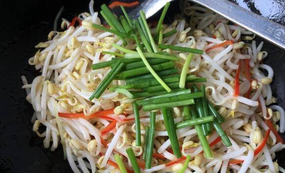 最佳答案用料:绿豆芽200克、油适量、盐1克、红椒1个、香葱3根、姜丝3克、干花椒。1、绿豆芽摘去根须洗净备用。2、红椒切丝,香葱切段,姜切丝。3、锅中油热后放入干花椒,炸香后捞出。4、跟着放入姜丝和红椒丝煸炒片刻。5、倒入豆芽,同时调入盐,大火快炒。6、放入葱段翻炒几下关火,放少许鸡精,炒匀后即...