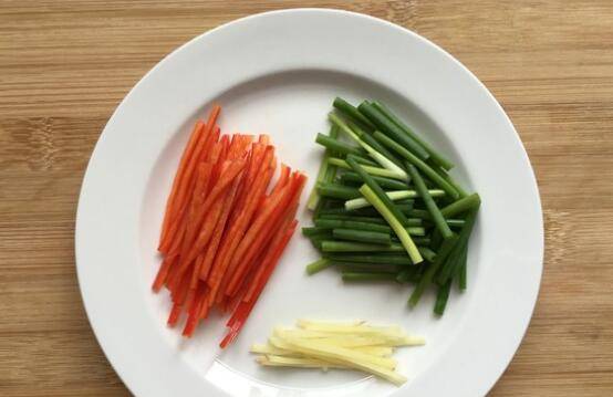 4、跟着放入姜丝和红椒丝煸炒片刻。
