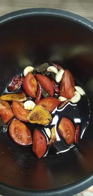 5、将调好的料汁倒入高压锅中,加入西红柿。