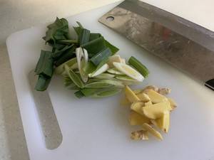 用料:牛干巴适量、蒜苗叶2根、干辣椒适量、花椒粒适量、姜片适量、料酒、鸡精。