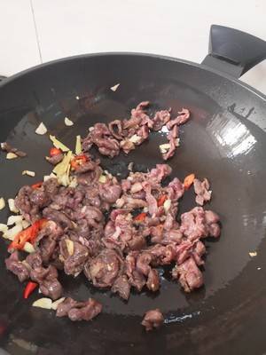 5、加热腌制好的牛腱肉,大火快速爆炒。