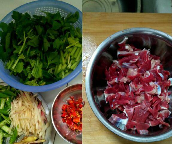 1、把所有材料洗净。嫩姜切成丝,青尖椒切成棱状,生姜切成片,蒜切成片,芹菜切成段,叶子分开放。