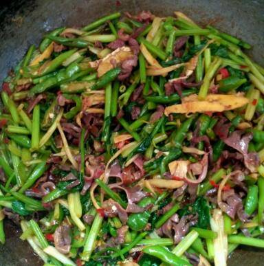 3、郡肝炒的差不多了,可以盛起来,也可以放锅边,然后放生姜片,蒜片,泡椒,豆瓣酱炒出香味,和郡肝一起炒。