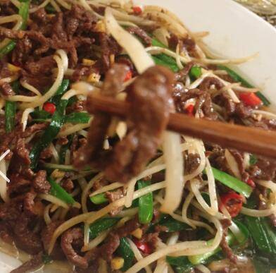 牛肉丝炒至变色放入小米辣翻炒2分钟,倒入少许盐和黄酒炒香。