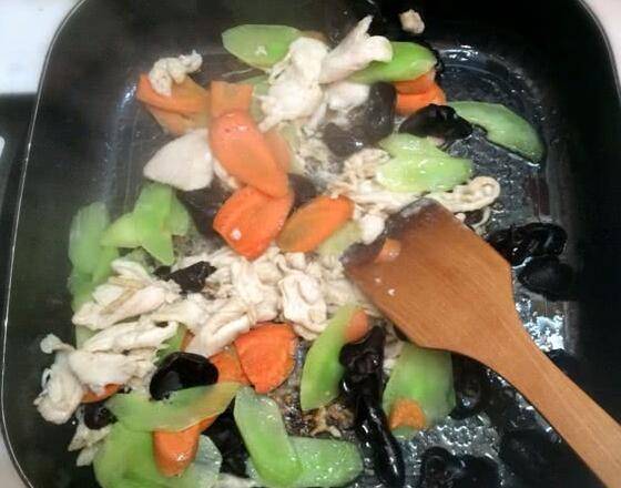 6、鸡肉片变白色后倒入已经焯烫过的蔬菜,加入一小勺盐炒混合就可以了。