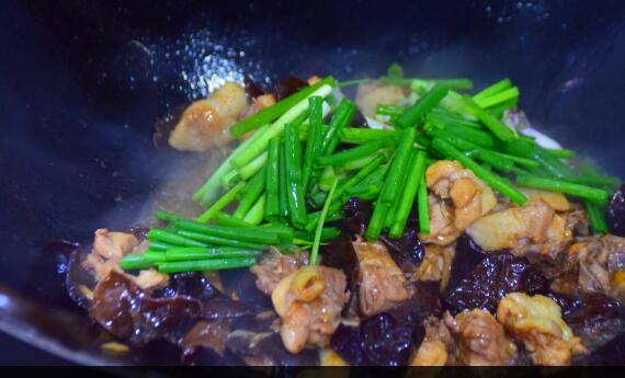 6、焖得时间差不多时,锅里的汤汁也所剩不多了,将切好的葱段放入锅中,翻炒几下就可以出锅装盘了。