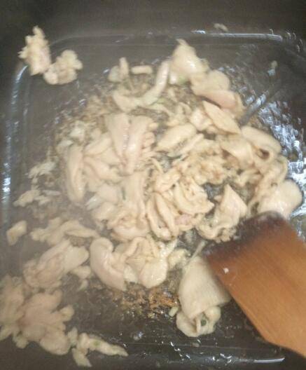 5、锅倒适量油,油热倒鸡肉片滑炒变色。
