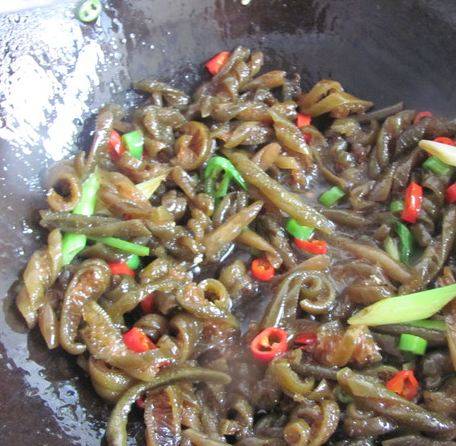 5、加入海茸快速翻炒,然后加入盐,鸡精,生抽调味,出锅。