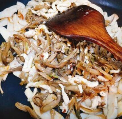 6.起锅,直接放入杏鲍菇,干煸。杏鲍菇煸的时候会出水,煸至边角微黄。
