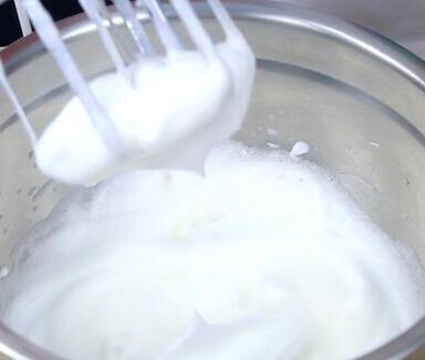 4、蛋白加入盐、柠檬汁搅拌,分三次加入糖,搅拌至湿性发泡。