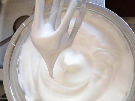 5、用打蛋器打至粗性发泡后继续加入细砂糖,继续打至蛋白接近硬性发泡。