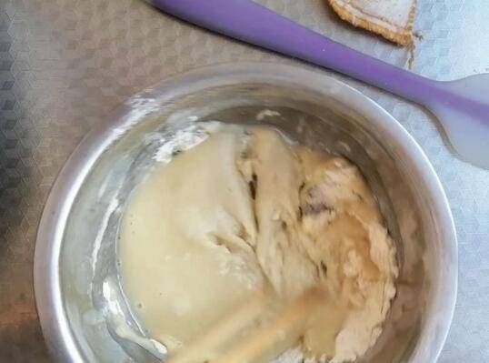 3、加入牛奶,继续搅拌,再加入蛋黄,继续搅拌。