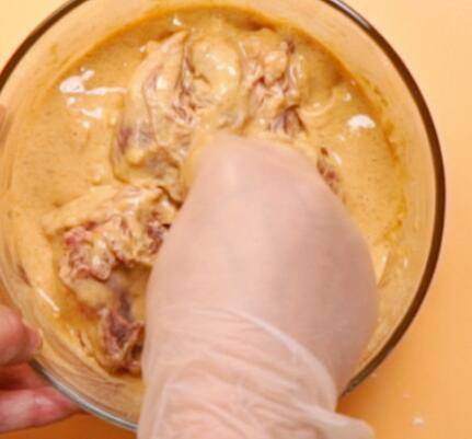2、放入排骨,倒入香脆炸鸡粉、料酒、清水,抓匀腌制1小时。