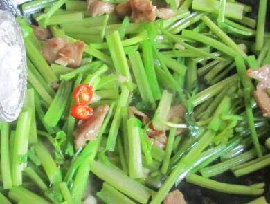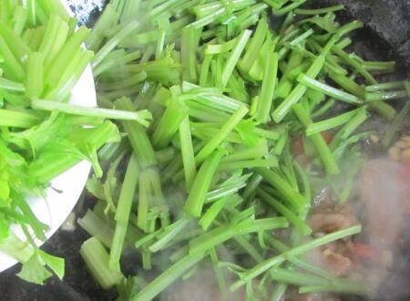 4、微微出香味后加入芹菜进去翻炒。