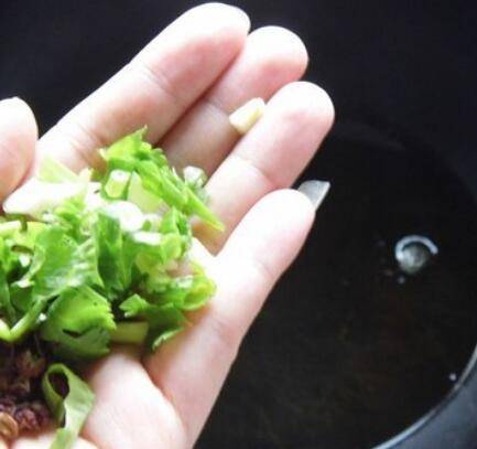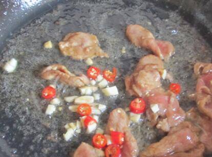3、油锅炒香蒜片、葱花、辣椒。