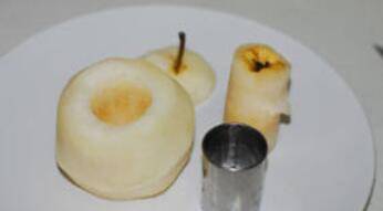 梨去皮,切去顶部;用圆形切模将梨核去除。