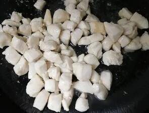 6、加入鸡丁、黄瓜丁翻版均匀即可。