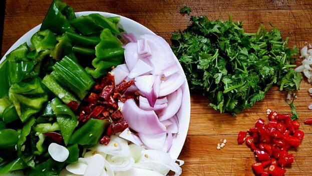 2、准备配料。洋葱、青椒切块,大葱、大蒜切碎,干辣椒剪段,香菜、小米辣切碎备用。