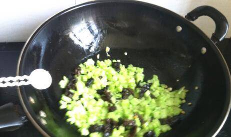 3、留底油,爆香蒜末,倒入苦瓜丁和黑木耳,翻炒,苦瓜、木耳炒至软熟,加盐调味。