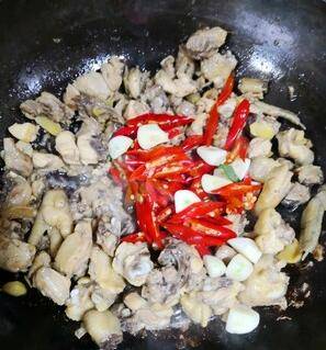 鸡剁小块,姜,切片,大蒜切粒,大蒜叶切斜片,泡椒切斜片。