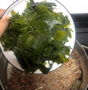 4、牛肉炒熟后,把裙带菜也倒进去炒一下。
