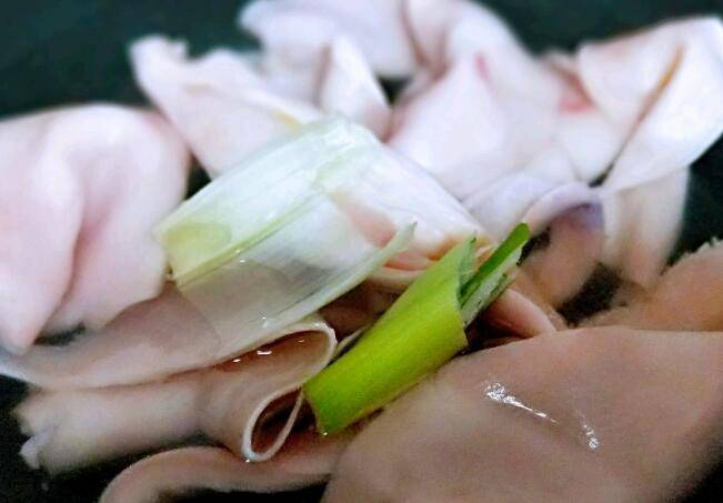 2、加入葱、姜、香叶、盐。大火烧开,撇出浮沫。煮2分钟捞出,又冷水冲洗。