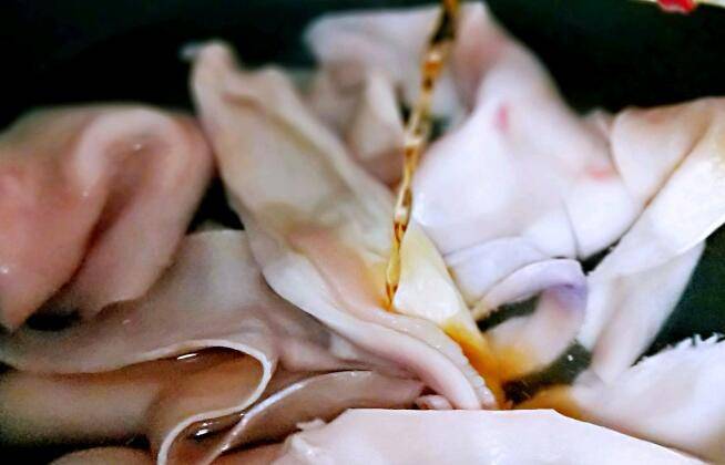 1、肉皮准备好,温水清洗好干净,之后焯水,冷水入锅。加入料酒。