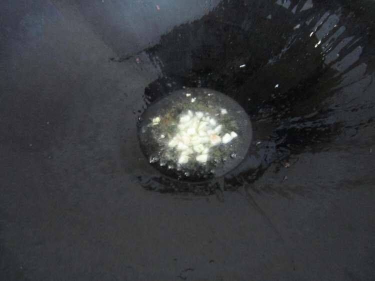 4、用余油煸香大蒜。