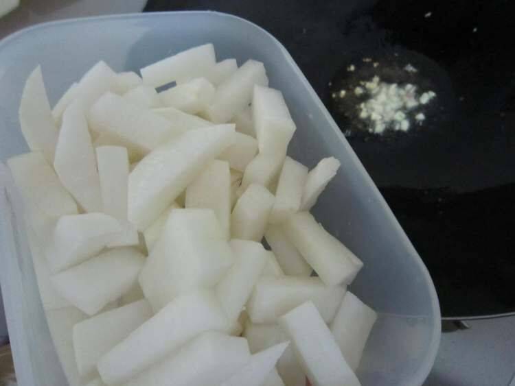 2、把香肠和萝卜切条,蒜切粒。