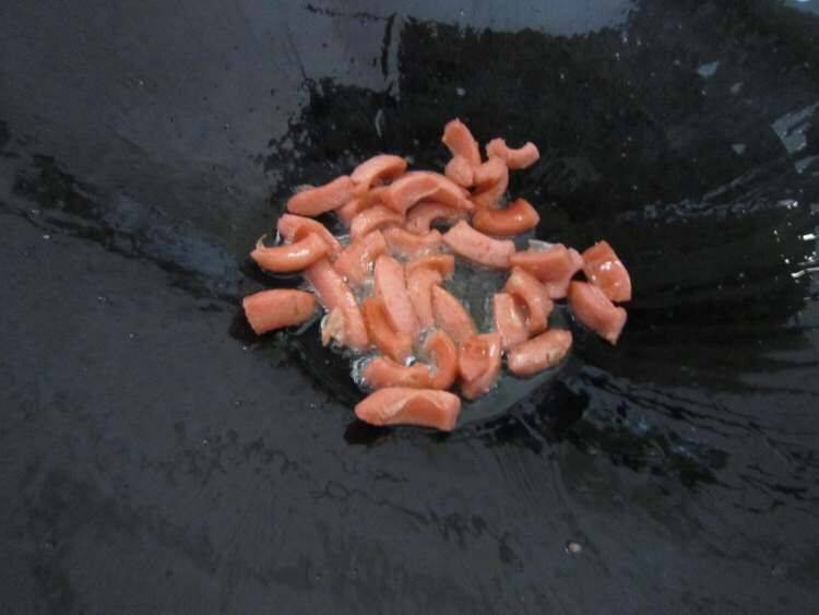 3、热油锅把香肠下锅煸炒至表面焦黄时取出备用。
