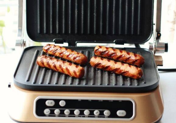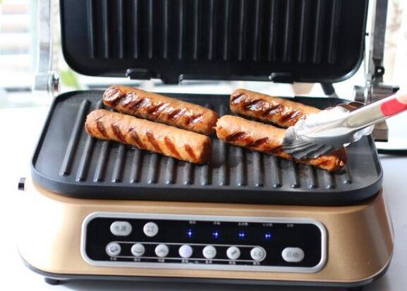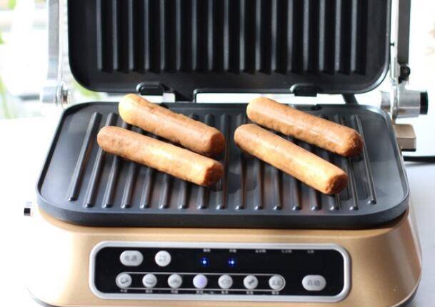 3、预热结束后,打开牛排机,摆放好香肠后合上盖子。
