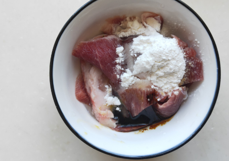 3、将瘦肉切块,倒入一点蛋清,加一勺玉米淀粉,加一小勺老抽,搅拌均匀,将葱切开。