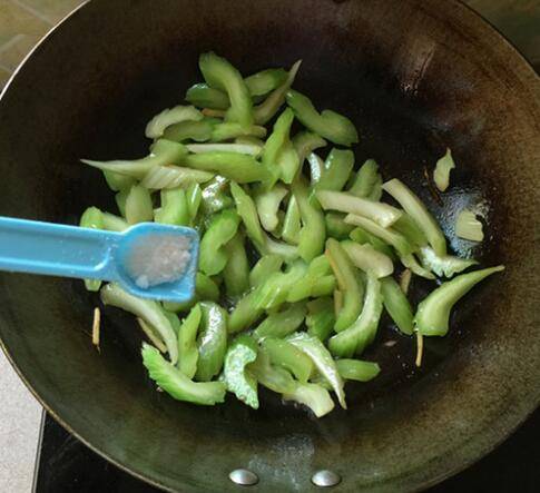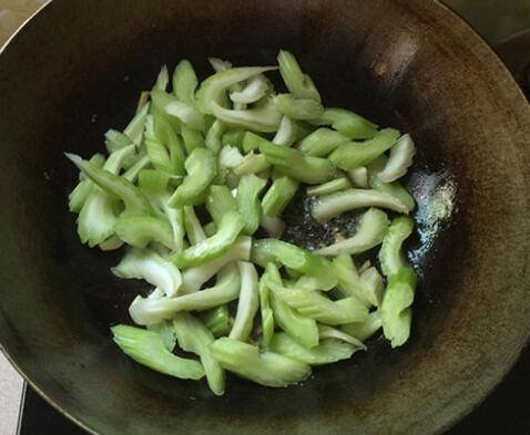 5、将莴笋片和辣椒一同倒入锅中,大火翻炒至莴笋软化。