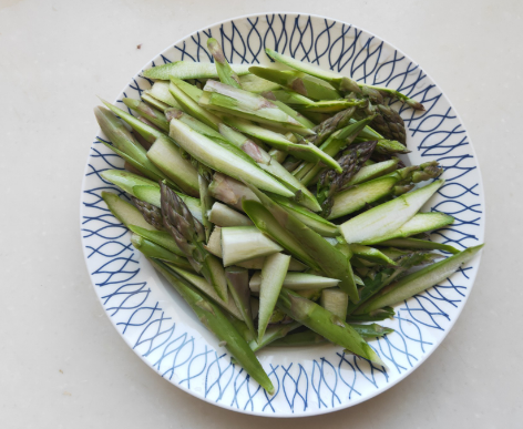 三、瘦肉炒芦笋。1、准备食材:芦笋、瘦肉100克、盐1勺、花椒粉1小勺、蔬菜鸡精1小勺、蛋清适量、玉米淀粉1勺、老抽1小勺、葱半根。