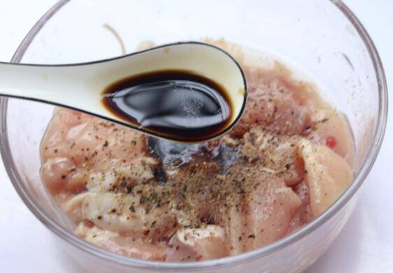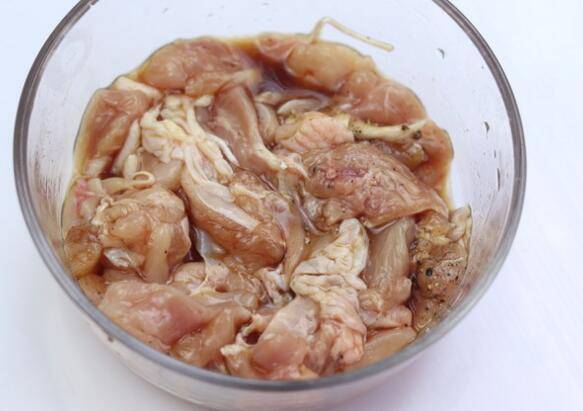 鸡腿肉去掉骨头,切成小块。加生抽、味极鲜、盐和胡椒粉