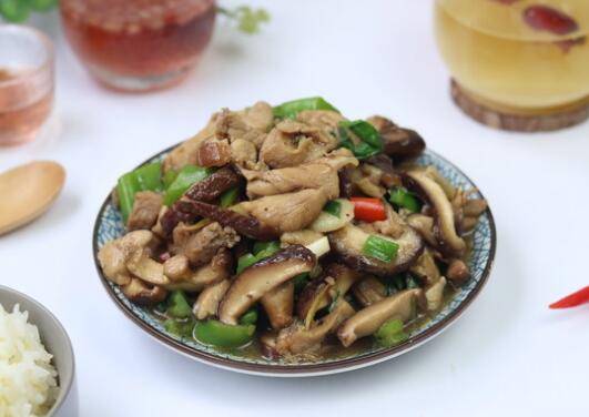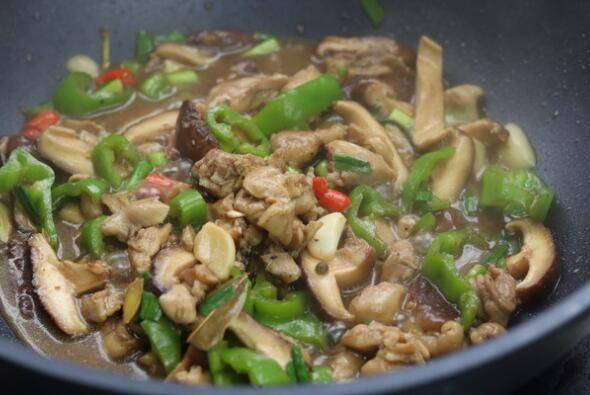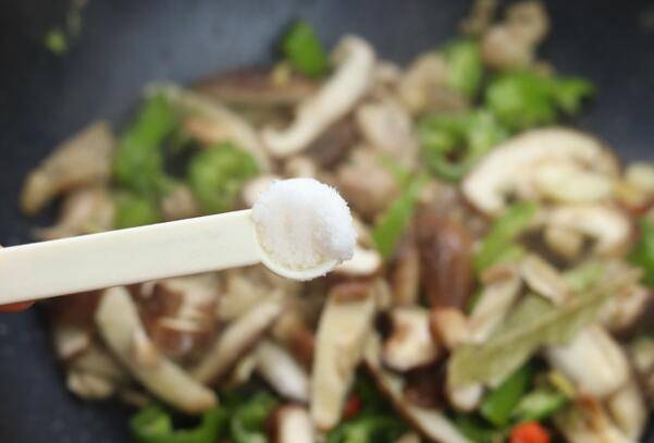 接着放入香菇和青椒,加盐、生抽和黑胡椒粉调味。