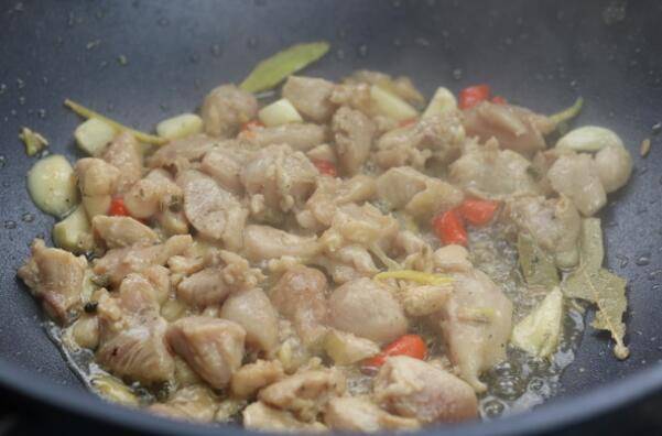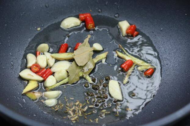 锅里放油,油热后,放入姜、蒜、小米椒、花椒、香叶和小茴香炒香