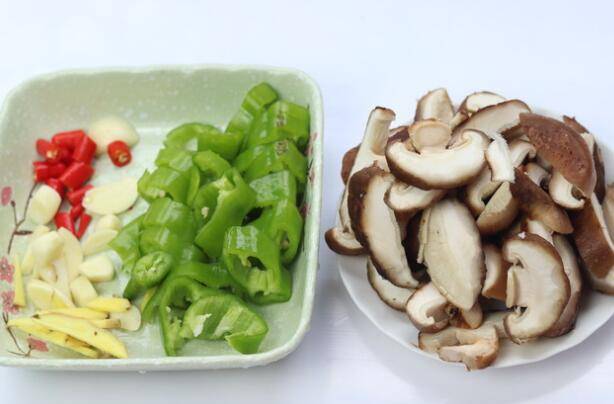准备食材:鸡腿、香菇、青椒、食用油、盐、生抽、味极鲜、黑胡椒粉、小米椒、香叶、花椒、小茴香、大蒜、姜。