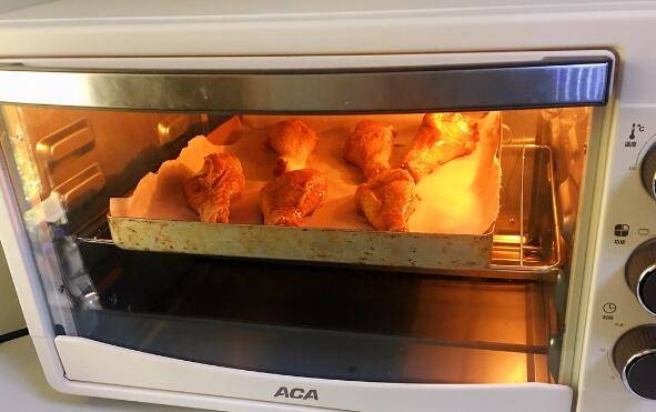 8、腌好的鸡腿放入垫了油纸的烤盘上。
