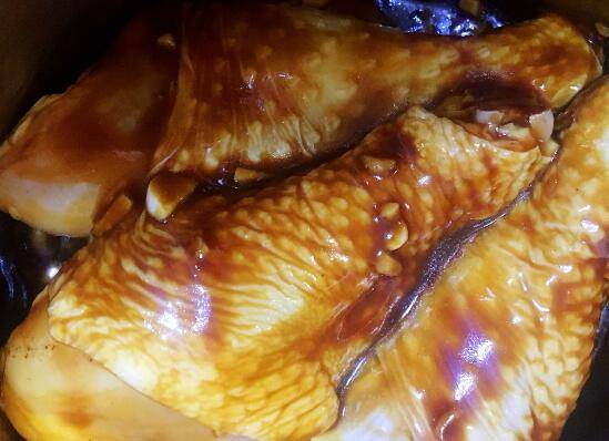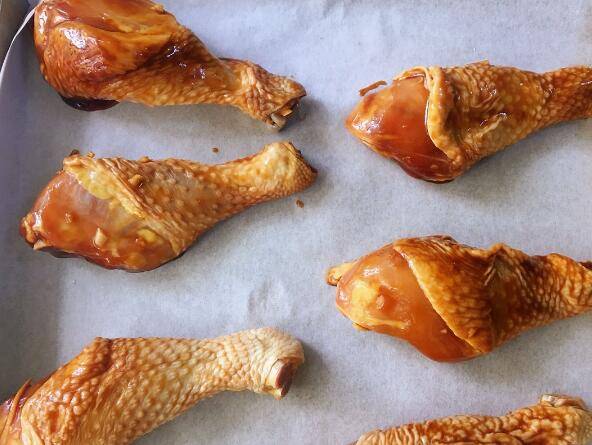 9、放入预热好的烤箱里,中层上下火180度烤四十分钟左右。中途取出翻面,可以再刷一层酱汁。