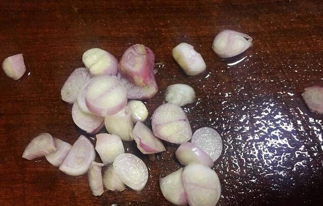 1、干葱去皮洗干净切成片状。