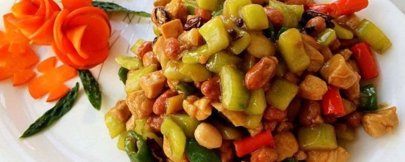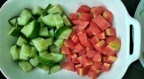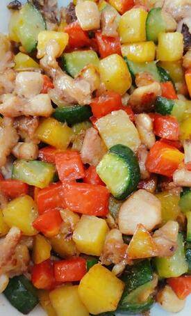 锅热放油将胡萝卜、土豆先炒一会再加入黄瓜,混合爆炒后加入鸡腿肉和盐一起炒。
