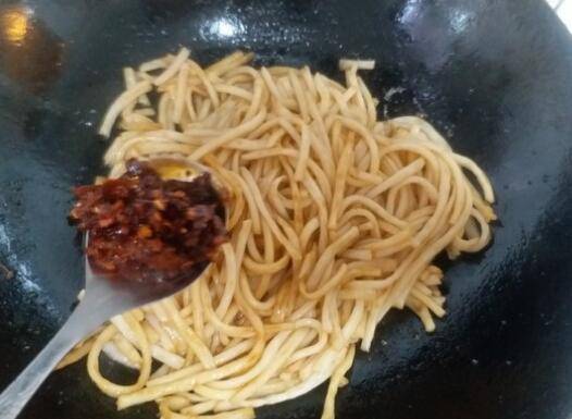 6、锅内再次倒入少量油烧热后倒入米线翻炒。