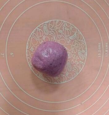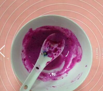 搅拌果泥倒入奶粉中,和成团。