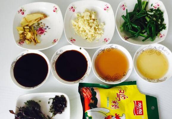 2、备齐所有调味料及佐料,姜切片和末两种,蒜切末、打5个葱节,另切些葱花,紫苏切段和末。