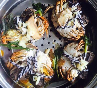 3、将洗净的蟹肚子朝上摆放蒸格中。